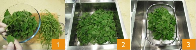 To prepare the nettle risotto, first, start by making the Vegetable broth. At this point, take care of cleaning the nettles: first, wear gloves to protect your hands from their stinging power, which will disappear once cooked. Remove the leaves from the nettles, eliminating the stems: you will obtain about 7 oz of cleaned nettles 1; then wash them in plenty of cold water 2 and let them drain 3.