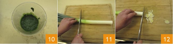 until you obtain a smooth cream 10. Then set it aside and move on to the risotto. Take the leek, remove the ends 11, and slice it thinly 12.