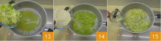 In another saucepan, pour the remaining amount of oil, then add the leek 13, let it wilt over low heat for 4-5 minutes; then add the rice 14 and toast it, stirring often. When it changes color, deglaze with white wine 15.