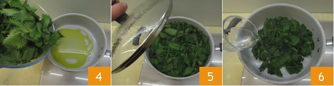 Pour 2 tsp of oil into a saucepan, let it heat, then add the nettles 4, cover with a lid 5, and when they are slightly wilted, add a little water (about 1/4 cup) 6 which will help the cooking.