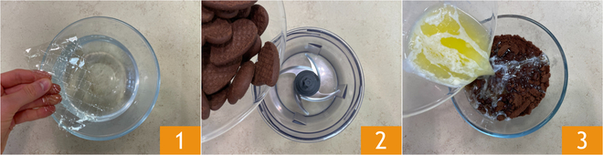 To prepare the no-bake mint and chocolate crumble, first soak the gelatin sheets 1. Meanwhile, melt the butter in a saucepan and let it cool. Place the cookies in a food processor 2 and blend until you get a grainy mixture. Transfer everything to a bowl and add the melted butter 3.