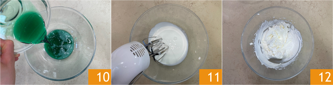 Add the rest of the syrup at room temperature 10, stir and let it cool. Meanwhile, whip the cream 11 12.