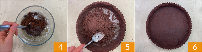 Mix well 4. Pour two-thirds of the mixture into a 9-inch diameter removable-bottom pan. Use this amount to make the edge 5, then add the remaining part for the base 6. Place in the refrigerator to set for 10-15 minutes.