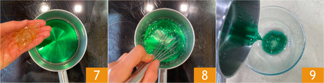 In the meantime, prepare the filling: take 1/4 cup from the total mint syrup and heat it in a saucepan, then add the well-squeezed gelatin sheets 7. Stir and let it melt completely 8. Pour the syrup into a bowl 9.