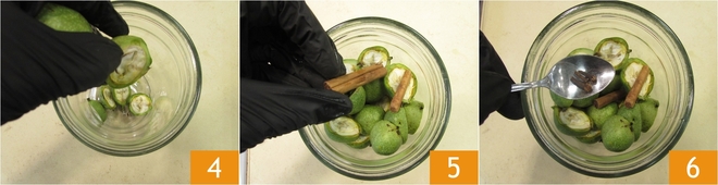 To prepare your nocino, start by thoroughly washing the fresh walnuts 1. Then, if possible, wear gloves, as they tend to stain hands during subsequent processing. Cut the walnuts in half 2 3.
