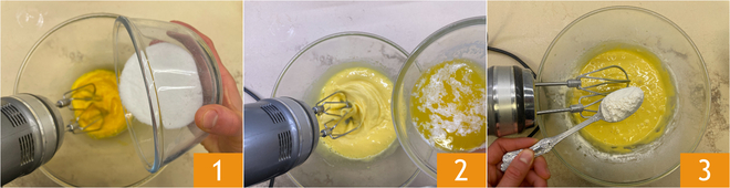 To prepare the Nutella and mascarpone cake, first melt the butter in a saucepan and let it cool. Meanwhile, beat the eggs together with the sugar using electric beaters 1. After about 10 minutes, the mixture will be puffy and frothy, so pour in the melted and cooled butter in a thin stream 2. Finally, add the previously sifted dry ingredients, keeping the beaters running: start with the flour, one tablespoon at a time 3.