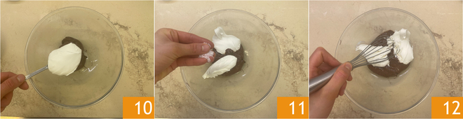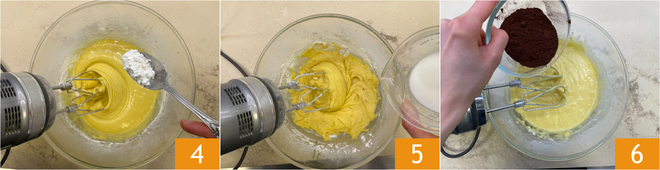 Add the cornstarch in the same way 5. After incorporating the dry ingredients, dilute with the milk 5 and finally add the cocoa powder 6.