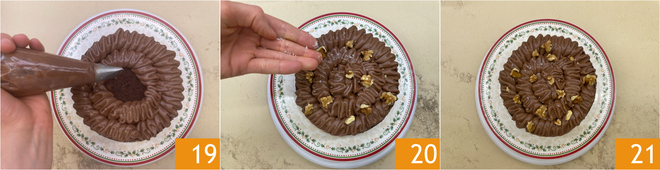 With the remaining cream, decorate the surface by creating small waves with downward movements 19. Finally, garnish with walnuts and Maldon salt 20. Your Nutella and mascarpone cake is ready to be enjoyed 21!