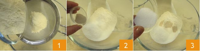 To make the Nutella braid, sift the flours into the bowl of a stand mixer 1, add the dry yeast 2 and sugar 3 and salt.