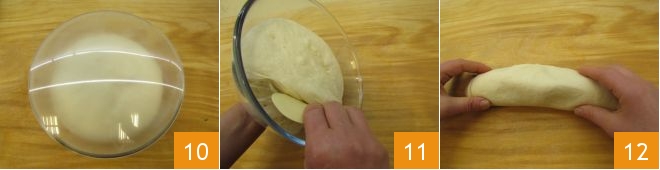 After this time, retrieve the dough 10 and transfer it to a work surface 11. Knead it for a few seconds to form a log 12