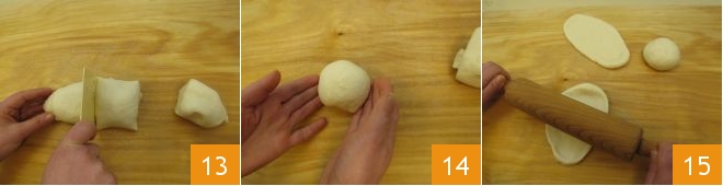 and divide it into 3 equal portions 13, shaping each into a sphere 14. Roll each sphere using a rolling pin 15 until you obtain ovals about 8 inches long and 4 inches wide.