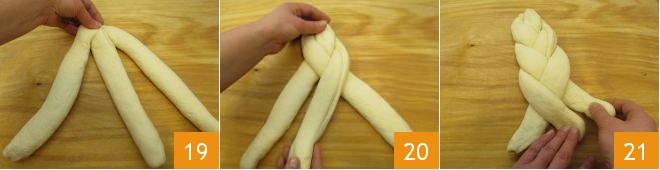 Once you have obtained 3 logs of the same size, pinch the top ends together 19 to secure them and proceed to braid them together 20 to the end 21.
