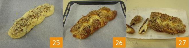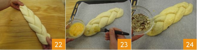 Once you have finished your braid, lift it and at the same time gently stretch it 22, then transfer it to a baking sheet lined with parchment paper. Lightly beat an egg, use it to brush the braid 23, and garnish it with hazelnut granules 34.