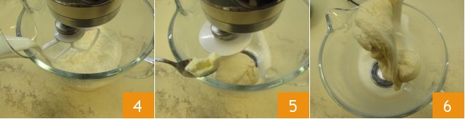 Turn on the mixer fitted with the paddle attachment and slowly pour in the milk at room temperature 4. Once a uniform mixture is obtained, switch the paddle for the dough hook and continue working the dough, adding the softened butter a little at a time 5. Wait another 15 minutes until the dough is well incorporated around the hook.