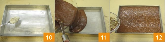 Grease and flour a rectangular pan measuring 9x13 inches 10 and fill it with the mixture 11, then sprinkle the top with chopped hazelnuts 12. You can bake it in the lower part of the oven, preheated to 340°F, for 20 minutes.