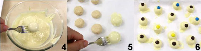 Let it cool slightly before dipping the eyeballs with a fork 4. Move the fork to remove excess chocolate and place the eyeballs on the parchment paper 5, immediately place a colored chocolate candy on top of each eyeball 6 (as if it were the iris of the eye). Place in the refrigerator for about 10/15 minutes to harden the white chocolate. When the white chocolate is completely hardened, remove the drips at the base using a sharp knife.