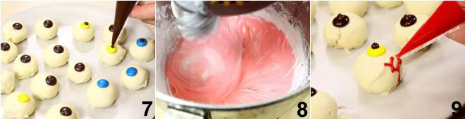 With the melted dark chocolate, create the pupil on top of each chocolate candy using a piping bag or a toothpick 7. Finally, prepare the red royal icing to create the eye veins: whip the egg white in a stand mixer until it's white, then add the sifted powdered sugar, finally add enough red food coloring to achieve a nice intense red 8. Place the icing in a piping bag with a small tip opening and create the red veins around the eye, starting from the base of the eye and drawing irregular veins towards the pupil 9.