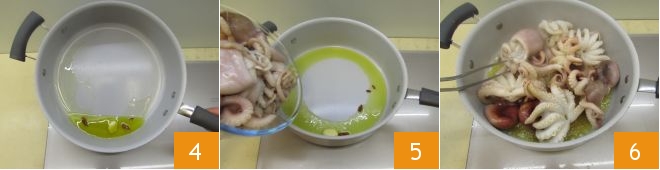 Heat well for 1-2 minutes, tilting the pan so that the oil can be well infused with garlic and chili pepper 4, but be careful not to burn them. At this point, add the baby octopuses 5 and let them sear for 2-3 minutes over high heat, turning them occasionally with tongs 6.