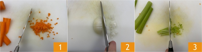 To prepare octopuses in broth, first ensure your octopuses are already cleaned; rinse them under water and leave them in a colander. Peel the carrots and chop them finely 1. Peel the onion and chop it too 2, then peel the celery and chop it to the same size as the carrots and onions 3.