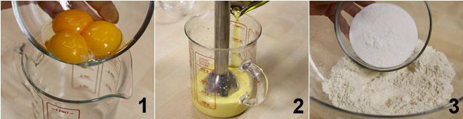 Put the whole eggs plus the yolk in a bowl 1 and beat with the sugar for one minute. Then, while continuing to beat, add the extra virgin olive oil and the flavors (the vanilla bean seeds and the lemon zest) 2. Sift the flour and baking powder into a bowl 3, add the salt,
