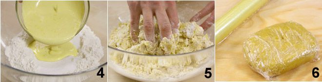mix with the egg and sugar mixture 4 and start kneading 5: when you have combined all the ingredients and obtained a smooth and homogeneous dough, wrap it in cling film 6 and let it rest in the refrigerator for at least half an hour.