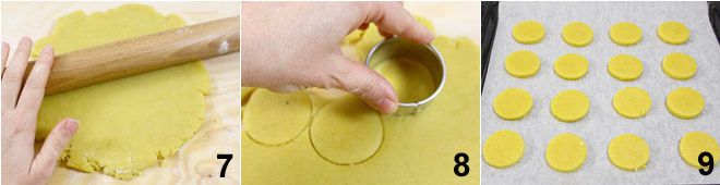 After the indicated time, roll out the dough on a floured surface until it's 1/4 inch thick 7, then cut out round shapes with a 2-inch diameter 8 and place them on a baking sheet lined with parchment paper 9 and bake in a preheated static oven at 350°F for about 15 minutes. Once cooked, remove the cookies from the oven, let them cool completely, and then store them in a tin box with a lid or in an airtight container.