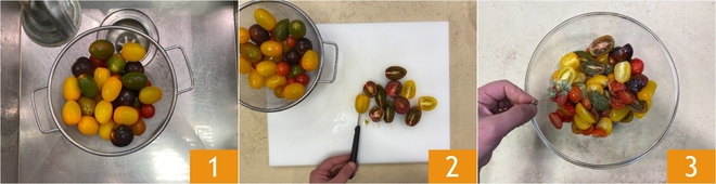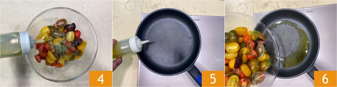 Extra virgin olive oil 4, salt, pepper, and mix. Now in a pan, which measures 9.5 inches at the base and 11 inches at the surface, pour a drizzle of oil 5. Add the cherry tomatoes 6.