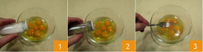 To prepare the omelette with stracchino and cooked ham, put the eggs in a bowl and season with salt and pepper to taste (1-2); beat the eggs 3,