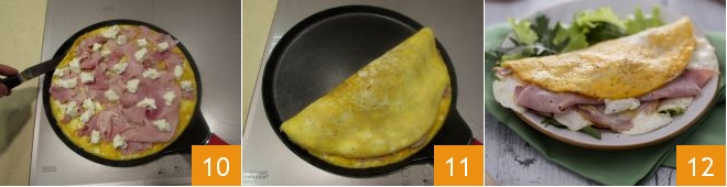 finally, with the help of a knife or a spatula 10, fold the omelette in half, closing it like a book 11: with our quantities you should obtain two omelettes with stracchino and cooked ham 12 which you can divide into 4 portions and serve.