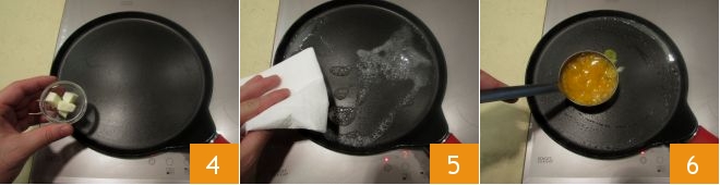 then place a nonstick crepe pan with a diameter of 10 1/4 in (26 cm) over the heat along with the butter cut into pieces 4. While the butter melts, spread it evenly with a paper towel 5, then pour half of the beaten egg mixture 6.