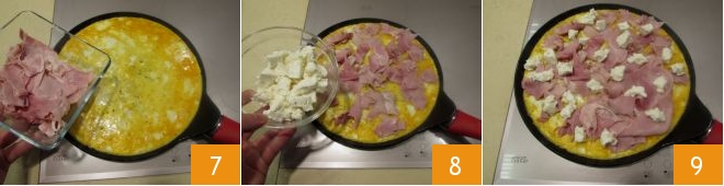 Cook for 3-4 minutes over medium heat, then add the ham slices 7 and the stracchino cut into cubes 8. Cook again for a few moments 9,
