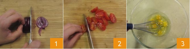 To make the omelette with tomatoes and basil, clean the onion and slice it thinly 1. Wash and dry the cherry tomatoes and then cut them into quarters 2. In a bowl, pour the eggs and beat them with a whisk 3.