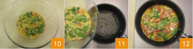 Mix again to evenly distribute the ingredients in the mixture 10. Now start cooking: heat the oil in a non-stick pan, and when it's hot, pour the mixture 11 12,