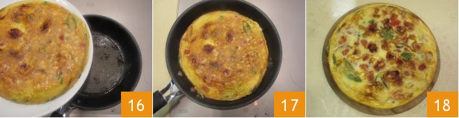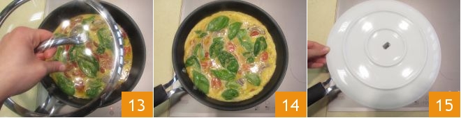 cover with the lid 13 and let the omelette cook for 10 minutes on moderate heat. After the 10 minutes 14, flip the omelette: to do this, use the lid or a plate, place the plate on the pan 15