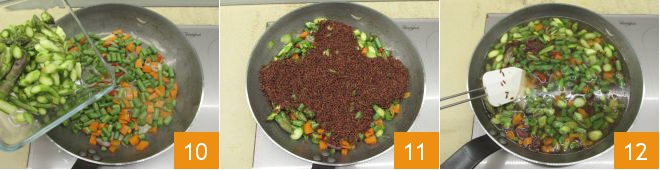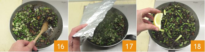 After the first 20-25 minutes of cooking, check that the rice hasn't dried out too much, then add the peas 13, the broad beans 14, and the asparagus tips 15 and continue cooking.