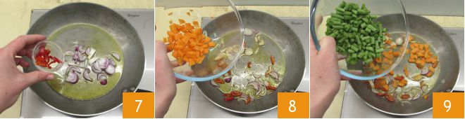 Heat a large iron skillet with a drizzle of oil, add the onion and chili pepper 7, and briefly sauté over high heat, stirring with a wooden spoon. Add the carrots 8 and sauté them for a few moments, then add the green beans 9