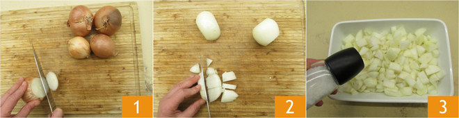 To prepare the onion calzone, first clean the onions 1, wash them several times to remove the acidity. Roughly chop the onions 2. Place the onions in a baking tray, season with salt 3.
