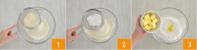 To prepare the orange and mango tart, first make the crust. Sift the flour 1 and powdered sugar 2 into a bowl, add the grated lemon zest and the butter cut into pieces 3.