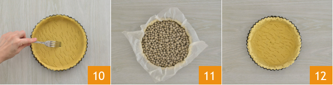 prick the bottom with a fork 10 and place a sheet of parchment paper inside. Proceed with blind baking by placing ceramic balls 11 or beans inside the tart. Bake at 356°F for 15 minutes, then remove the base, eliminate the ceramic balls and parchment paper 12, and bake for another 15 minutes.