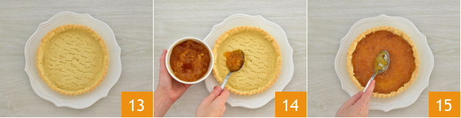 Once baking is complete, let the tart base cool completely 13 and remove it from the pan. Fill with orange marmalade 14, spreading it well throughout the base of the tart 15.