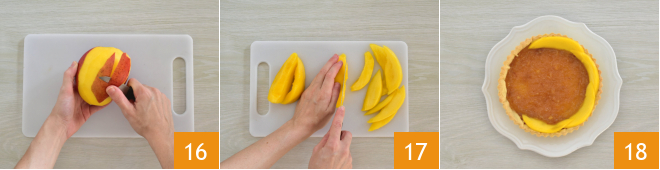 Peel the mango 16 and cut into thin slices 17. Arrange them inside the tart, starting from the outside 18,