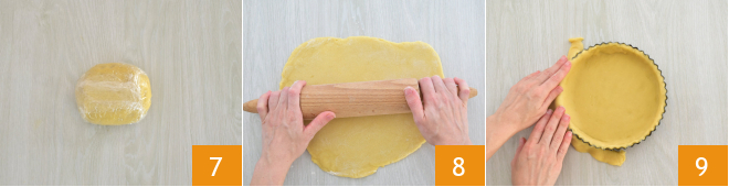 Wrap it in a sheet of clear plastic wrap 7 and let it rest in the fridge for an hour. Take the dough out and roll it onto the work surface to a thickness of about 1/8 inch 8. Butter a 7-inch pan and line it with the pastry dough. Trim the edges, cutting off any excess dough 9,