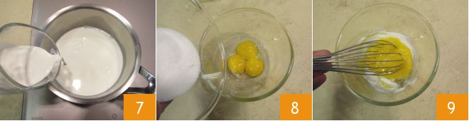 Meanwhile, prepare the cream by heating the milk and cream in a saucepan until it almost boils 7. In a bowl, whisk together the egg yolks, sugar 8, and orange zest 9.