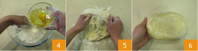 Add the egg 4 and gather all the ingredients, then transfer to the work surface 5 and knead the dough until you get a homogeneous dough ball. Cover with plastic wrap 6 and transfer to the fridge for about an hour.