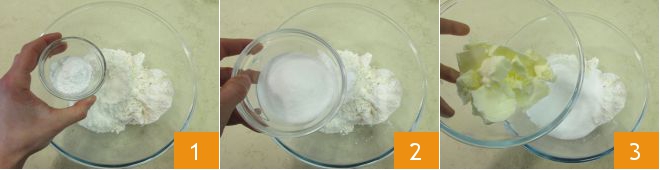 To prepare the orange cream tart, start by making the crust: in a bowl, pour the flour, the baking powder 1, and the sugar 2, then add the cold butter 3 in pieces and proceed with the hand-sanding method, pinching the dough with your fingers to obtain crumbs.