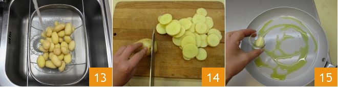 Meanwhile, prepare the potatoes: wash the baby potatoes under plenty of fresh running water 13. With a knife or a mandoline, slice them into rounds about 1/8 inch thick, without peeling them 14, placing them in a bowl of water as you go to prevent them from browning. Once done, sauté a peeled garlic clove with a drizzle of oil in a non-stick pot 15, then drain the potatoes and pat them dry with a clean kitchen towel.