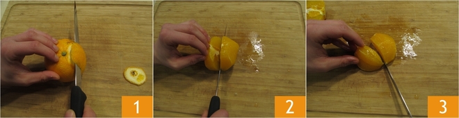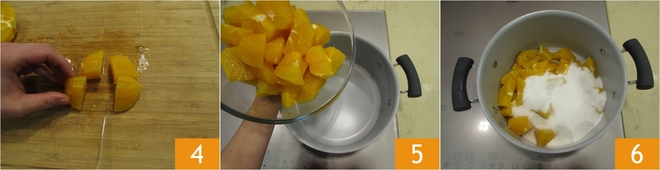 cut each half into 4 pieces 4. Repeat this operation for all the oranges until you obtain 2 lbs of orange pulp. Then transfer it to a pot 5 and add the sugar 6.
