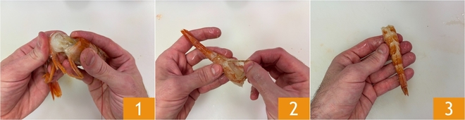 To prepare the orange prawns, start with the How to clean shrimp: separate the body from the head 1, remove the shell and the internal vein 2, and leave the tail attached 3.
