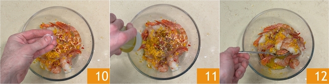 Extract the juice by squeezing the center of the orange into the bowl with the prawns 7. Now finely chop the garlic and chili pepper without seeds 8 and add the mixture to the prawns 9.