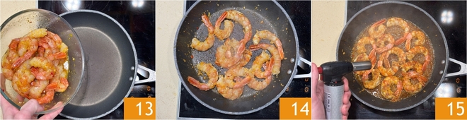 At this point, heat a non-stick pan well, then add the prawns with their marinade 16 and brown them for 2 minutes over medium-high heat 17. Pour in the Grand Marnier and flambé with a kitchen torch to evaporate the alcohol, being careful not to get burned 18. Continue cooking for another couple of minutes and turn off the heat.